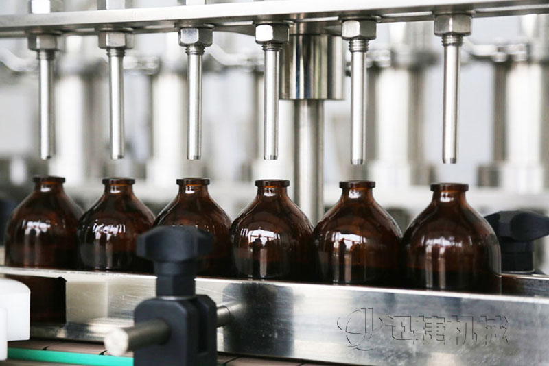 灌裝時灌裝頭潛入瓶底,緩慢上升,可有效防氣泡。灌裝針頭設(shè)有防滴漏裝置,確保灌裝精度,合格率大于99%。用柱塞式計量泵執(zhí)行灌裝,精度高;泵的結(jié)構(gòu)采用快接式拆卸機(jī)構(gòu),便于清洗、消毒。